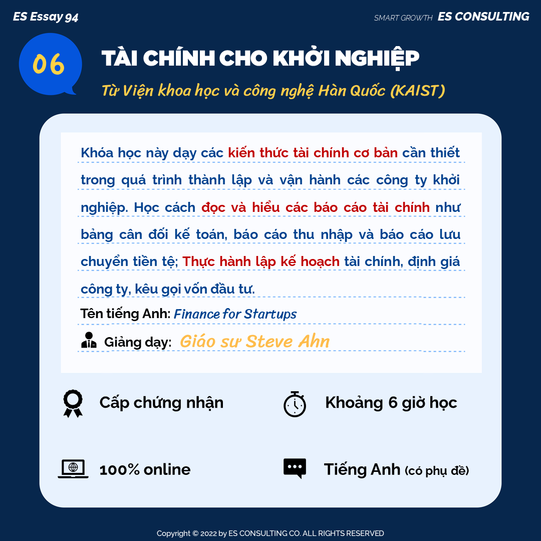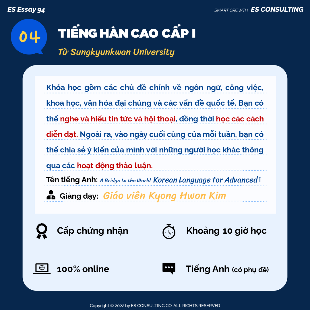 Hôm nay ES CONSULTING muốn giới thiệu đến các bạn 1 vài khóa học tiếng Hàn, kinh tế, tài chính được cung cấp bởi Trường Đại Học Sungkyunkwan, Trường Đại Học Yonsei, Viện Khoa học và Công nghệ Hàn Quốc (KAIST). Những khóa học này đều miễn phí nhưng có chất lượng cao, giúp bạn nâng tầm CV. 💻